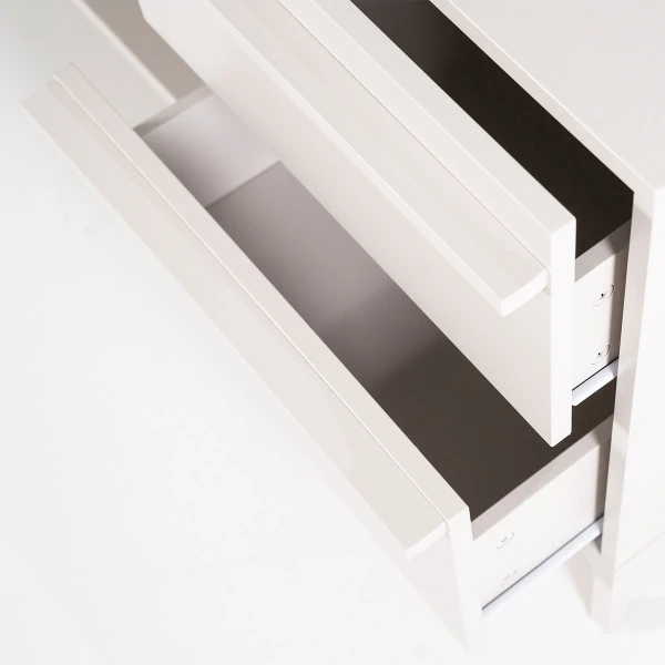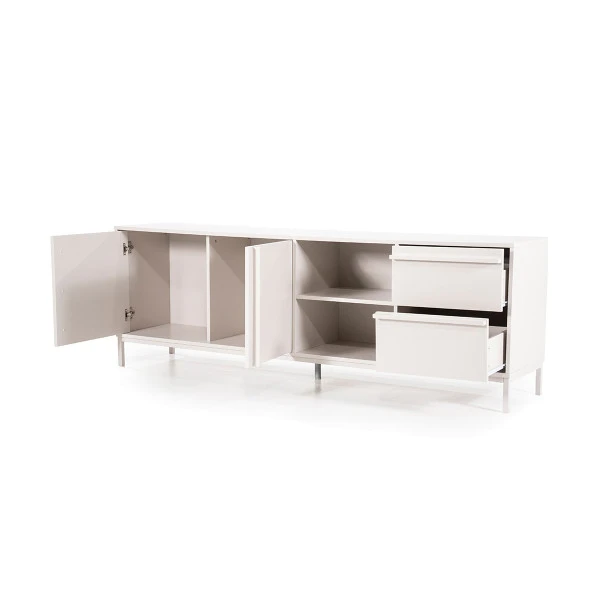 - Voorzien van 2 deuren, 2 lades en 2 open vakken