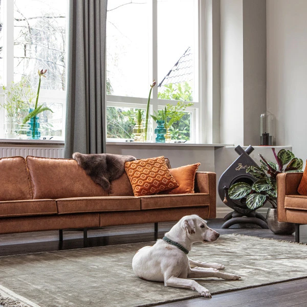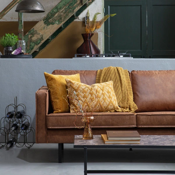 In de BePureHome Rodeo serie vind je banken, een fauteuil en een hocker van recycle leer. Dit is een mix van 70% echt rundleer – de restanten die overblijven bij het snijden van patronen- met 30% polyester: een nieuwe stof die recycle leer wordt genoemd. Maar je vindt in de Rodeo serie ook een 3- zits bank van fluweel!
