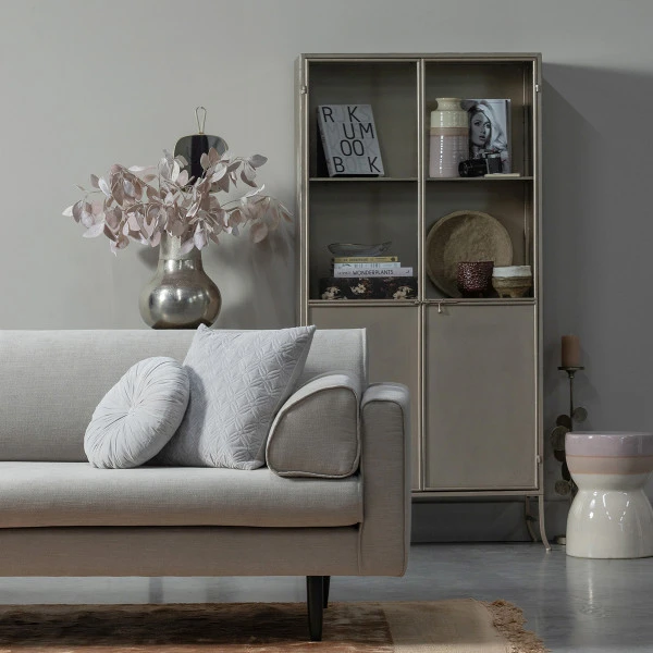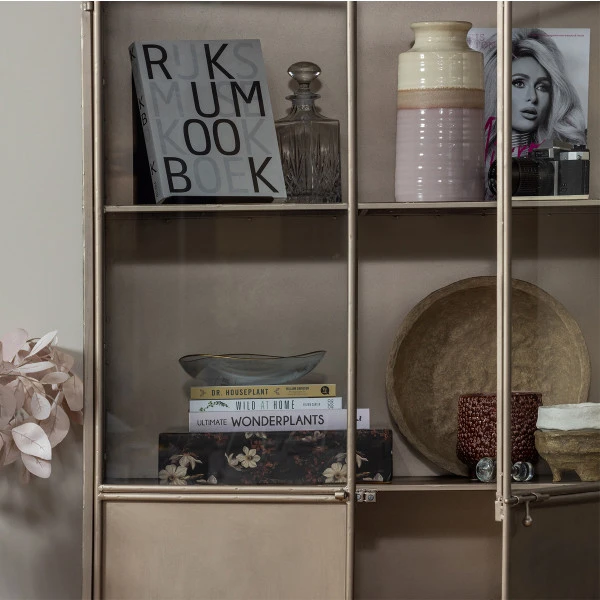 Gebruik de BePureHome Fossil vitrinekast voor serviesgoed in de keuken of geef de kast een mooi plekje in de woonkamer, en etaleer kunst of boeken achter de glazen ramen. Voor alledaags servies of administratie is plaats achter de champagne kleurige deuren van metaal. Wat mag er in jouw vitrinekast staan?