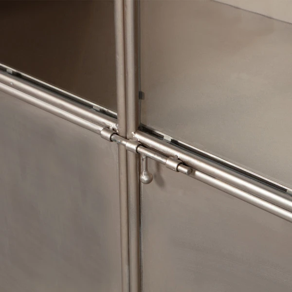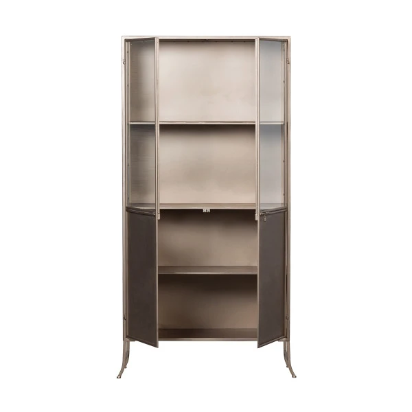 - De vitrinekast is gemaakt van metaal met een poedercoating