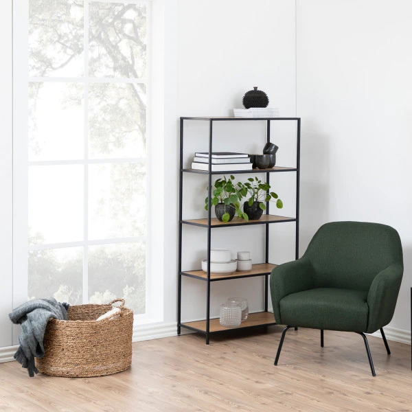 Deze boekenkast met 5 houten planken heeft een ruimtelijk design met strakke, moderne lijnen en een industrieel tintje: dat komt door de mix van hout en metaal. Vul de open vakken met je favoriete boeken en laat af en toe een plekje vrij voor een mooi beeldje of een leuke foto in een lijst. Je kunt de boekenkast met 5 houten planken natuurlijk ook gebruiken voor serviesgoed in de keuken.