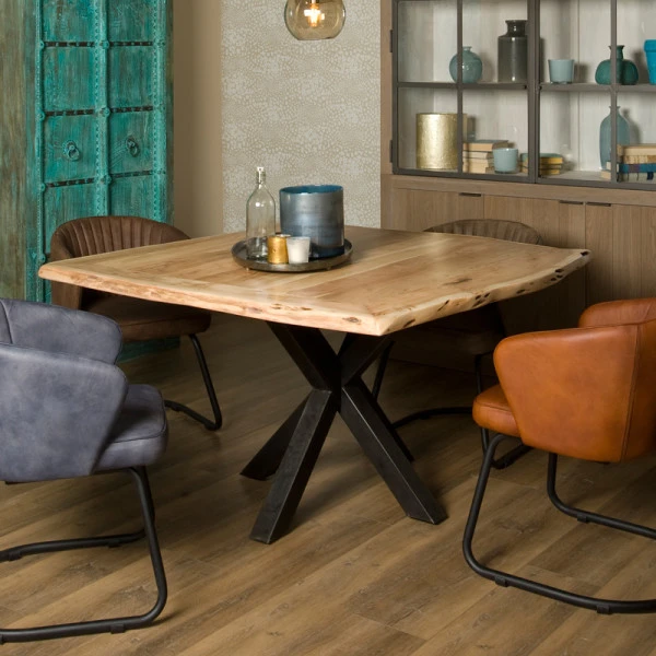 Met de Tower Living Soria eettafel haal je veel sfeer in huis. Het vierkante boomstam blad heeft een natuurlijke lijn. In het acaciahout zie je bovendien de knoesten en kleurschakeringen van de boom nog prachtig terug! Tegelijkertijd zorgt de spinpoot van donker gelakt staal voor een stoer geheel. Een eettafel met een industriële uitstraling.