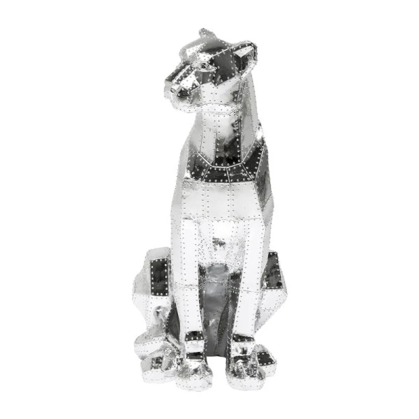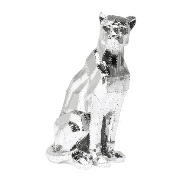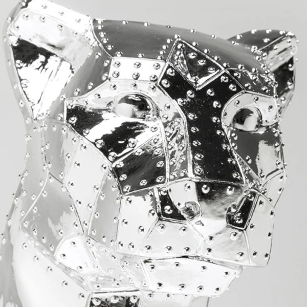 Dit Kare Design Rivet beeld combineert de elegantie van een wilde kat met het stoere karakter van de vele klinknagels, die het beeld een industriële uitstraling geven. Met een hoogte van 82 centimeter is het beeld relatief groot: een echte blikvanger, mede dankzij het zilverkleurig kunsthars en de statige houding van het luipaard. Mooi naast de deur naar de tuin als een bewaker van je huis!