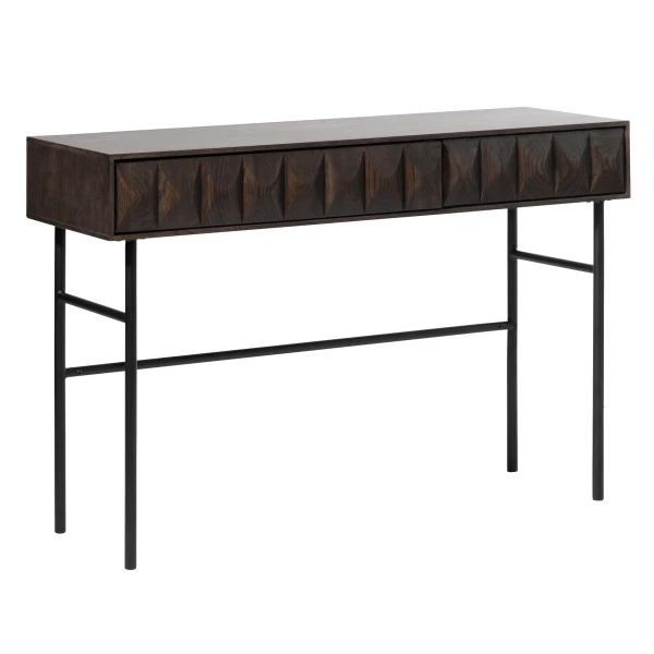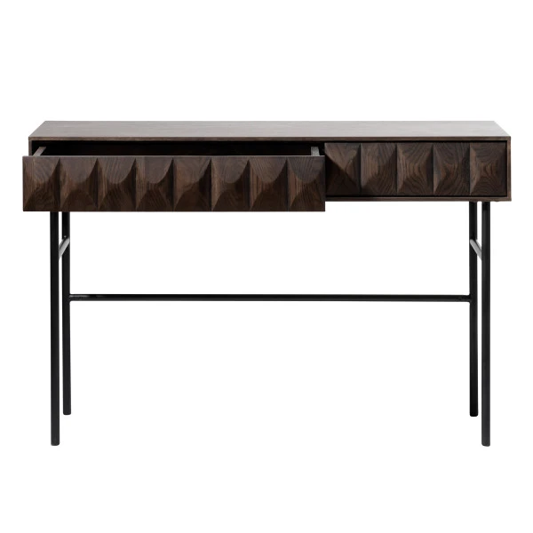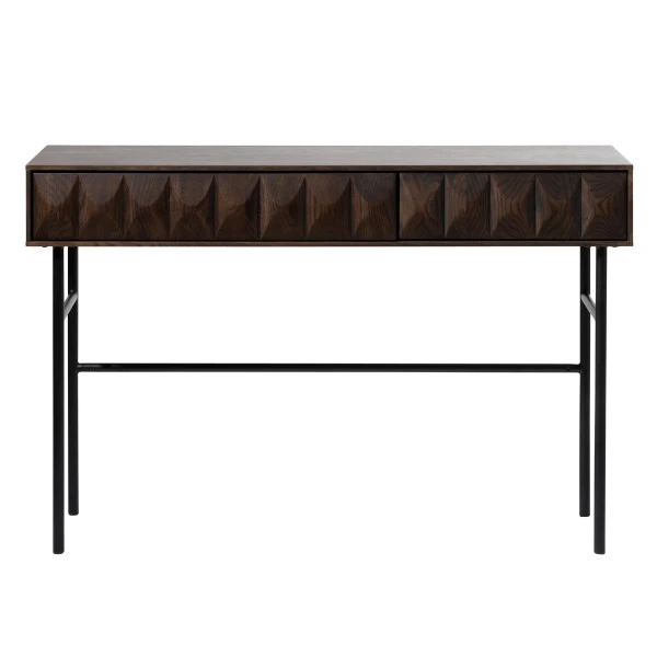 Dit wandtafeltje van donkerbruin eikenfineer neemt weinig plaats in, maar zorgt toch volop voor sfeer! Omdat het wandtafeltje slechts 39 centimeter diep steekt kun je deze heel goed gebruiken in een krappe hal of tegen de muur in de woonkamer. Zet bijzondere kunst bovenop, of een groene plant met een paar foto’s in mooie lijstjes. In de lades van donkerbruin eikenfineer is plaats voor post, sleutels en rommeltjes.