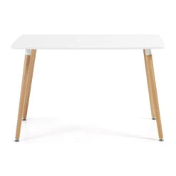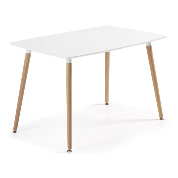 Een compacte tafel van Kave Home in een stijlvol, Scandinavisch design. Het wit gelakte tafelblad staat elegant op slanke poten van beukenhout. Dankzij de lichte kleuren en het ruimtelijke ontwerp neemt de tafel een bescheiden plaats in de woonkamer of eetkamer in!