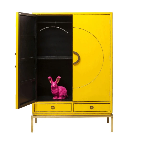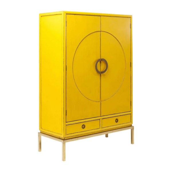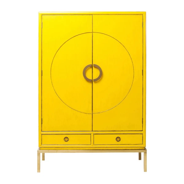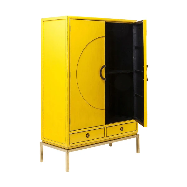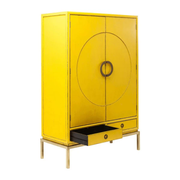 Bijzonder aan de Kare Design Disk wandkast is niet alleen het zonnige geel; ook het elegante cirkel patroon op de deuren zorgt voor een originele look. De accenten van goud gekleurd staal geven de wandkast bovendien een luxe uitstraling! Met twee lades en twee grote deuren kun je de wandkast gebruiken voor serviesgoed in de eetkamer, spelletjes en rommel in de woonkamer of linnengoed op de overloop.
