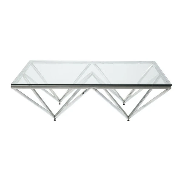 Deze Kare Design Network salontafel is voorzien van een zilverkleurig onderstel met een origineel ontwerp. Het gepolijst roestvrijstaal is gevormd tot een viertal omgekeerde piramides, waarboven een glazen blad van 105 bij 105 centimeter balanceert. Dankzij het elegante design en de mix van glas en metaal past deze salontafel erg mooi in een moderne of retro woonstijl.