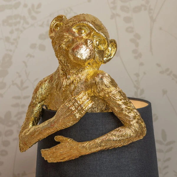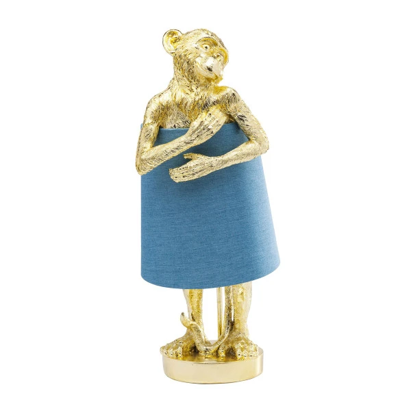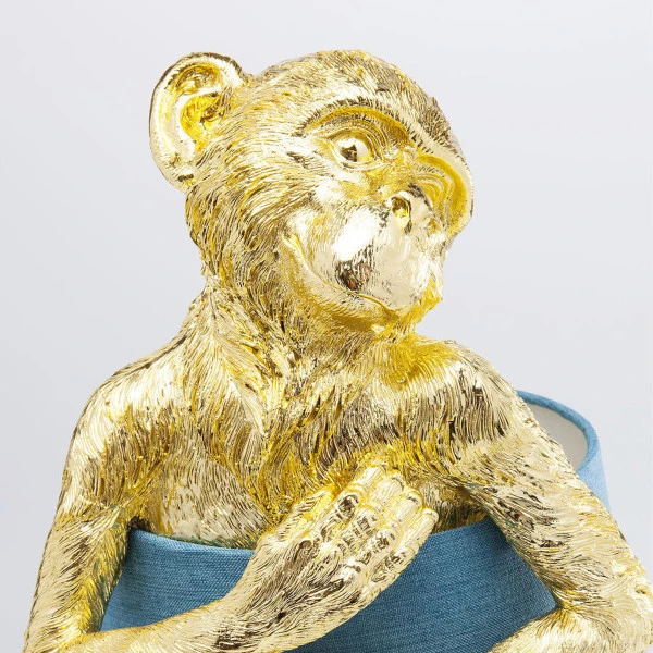 De gouden aap lamp in de Kare Design Monkey Gold lamp kijkt mee naar je televisieserie en lacht stiekem om de grapjes van de kinderen. Bovendien is de lamp een echte sfeermaker: dankzij de kap van blauw linnen krijgt het licht een zachte tint, en de gouden kleur geeft de aap een warme uitstraling. Een aanwinst voor elke woonruimte!