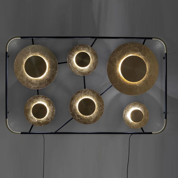 De Kare Design Disc wandlamp neemt de plaats in van dat ouderwetse schilderij en brengt op zijn eigen, moderne wijze een artistieke sfeer naar je woonkamer! Dankzij het grote formaat is de design wandlamp een echte blikvanger. Metalen schotels in chique goud schijnen je tegemoet als verduisterde zonnen. Het licht krijgt bovendien een warme tint dankzij de dubbele laag goud, waartussen de lichtbron verstopt zit.