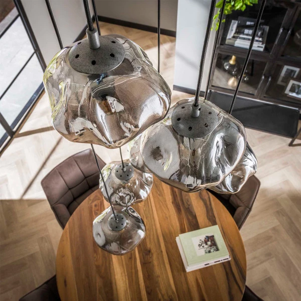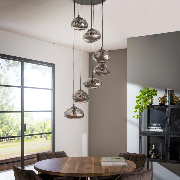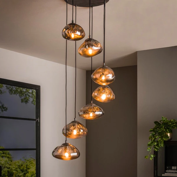 Deze trapse hanglamp met 7 lichtpunten is ideaal voor boven een ronde eettafel of een salontafel. Je kunt de 7 kappen afzonderlijk in hoogte verstellen voor de perfecte match met je tafel! De mix van glas met metaal geeft de hanglamp een stoere uitstraling, maar de kappen hebben ook iets natuurlijks dankzij de organische vorm: als een wolk in de lucht.