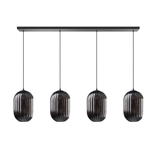 De kappen van deze ETH Glamm hanglamp hebben een spiegelende werking: daardoor krijgt het ribbelglas extra stijl! Met een breedte van 150 centimeter past de hanglamp met haar 4 kappen heel mooi boven een rechthoekige eettafel. Het licht krijgt een zachte en warme tint wanneer het door het donkere ribbelglas heen schijnt. De 4 kappen, aan een zwart metalen frame, zijn afzonderlijk in hoogte verstelbaar.