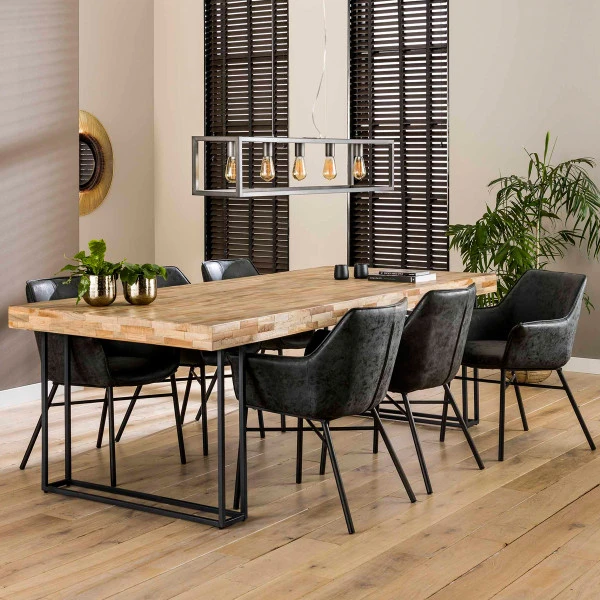 De 5 lichtbronnen in de hanglamp verdelen het licht mooi over je eethoek; gebruik kooldraadlampen voor een sfeervolle uitstraling. De hanglamp komt erg goed tot recht boven een robuuste eettafel van hout en metaal, of combineer met een design tafel en laat het metaal terugkomen in de vorm van een decoratie.