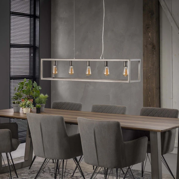 Deze hanglamp houdt 5 lichtbronnen gevangen in een frame van metaal. Een design lamp met een industriële uitstraling! Het frame van metaal is afgewerkt met een zilveren finish en lijkt te zweven boven je eettafel dankzij de transparante kabels. Met een breedte van 125 centimeter past de hanglamp mooi boven een rechthoekige tafel.