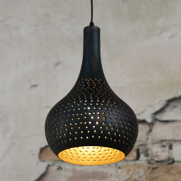Deze zwartbruine hanglamp heeft een industriële look met een Oosters tintje: daar zorgen de vorm van de hanglamp en de perforaties voor. Lichtstralen vinden hun weg door de kleine gaatjes en dankzij de zwartbruine, metalen kap krijgt het licht een warme kleur! Dat maakt van deze industriële hanglamp een echte sfeermaker.