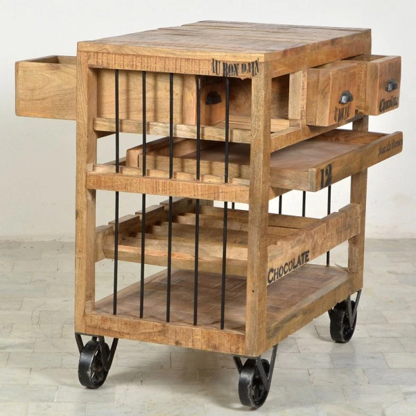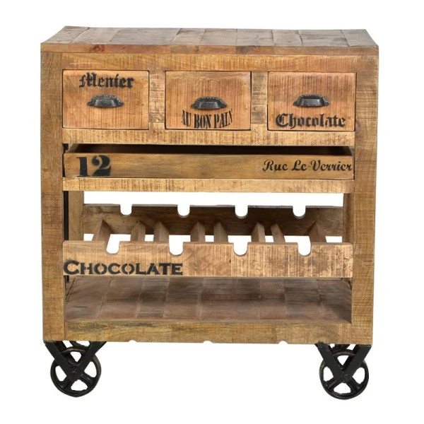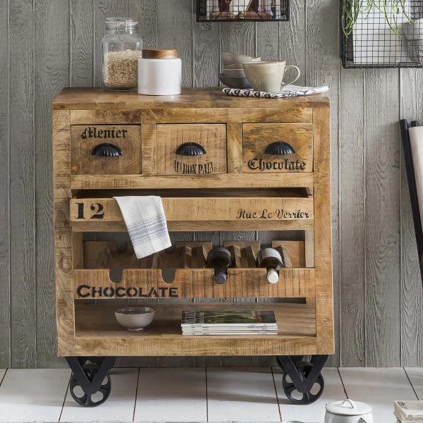 In deze wijnkast kun je meer kwijt dan alleen je beste flessen wijn. Berg kruiden op in de drie lades en leg je verse wortelen en aardappelen in het open vak. De keukentrolley heeft een uitschuifbaar dienblad waarop je ingrediënten kunt uitstallen tijdens het koken. Een gezellige, houten wijnkast in landelijke stijl met industriële accenten, die uitnodigt om direct aan de bereiding van een heerlijke maaltijd te beginnen! Leuk in combinatie met de buffetkast uit dezelfde Porter serie van Lavis.