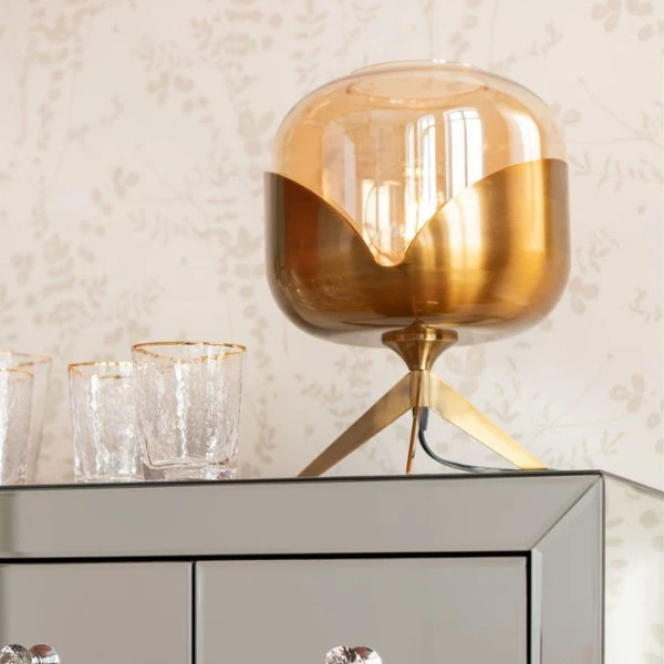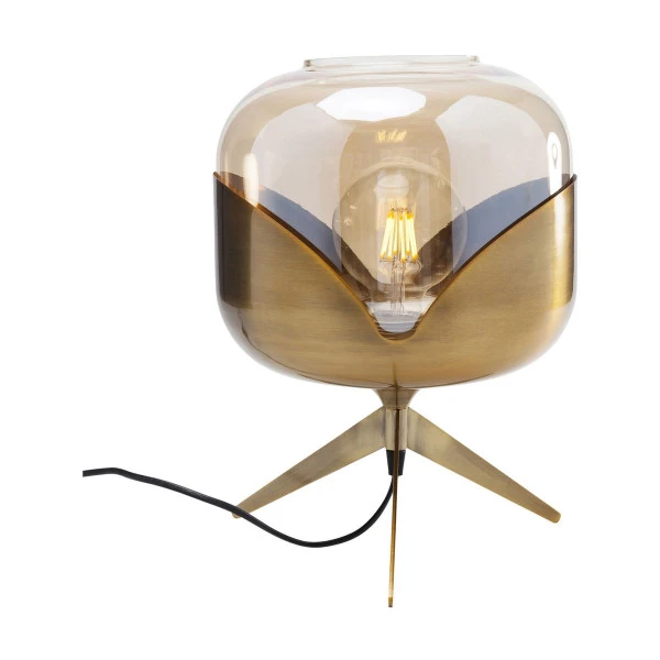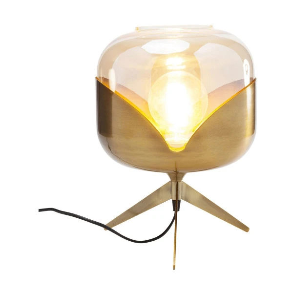 Bijzonder aan de Kare Design Goblet tafellamp is het retro design dat doet denken aan een bloem. Over het gekleurd glas ligt een subtiele laag van messing of chroom; aan jou de keuze! Welk materiaal past het mooiste in jouw interieur? De tafellamp staat op een speelse driepoot. Zet de lamp op een retro dressoir of gebruik als leeslamp in de zithoek. Ook middenin de boekenkast komt de tafellamp goed tot recht!