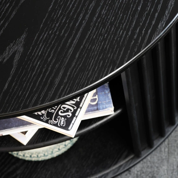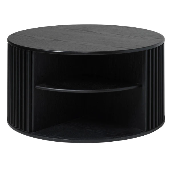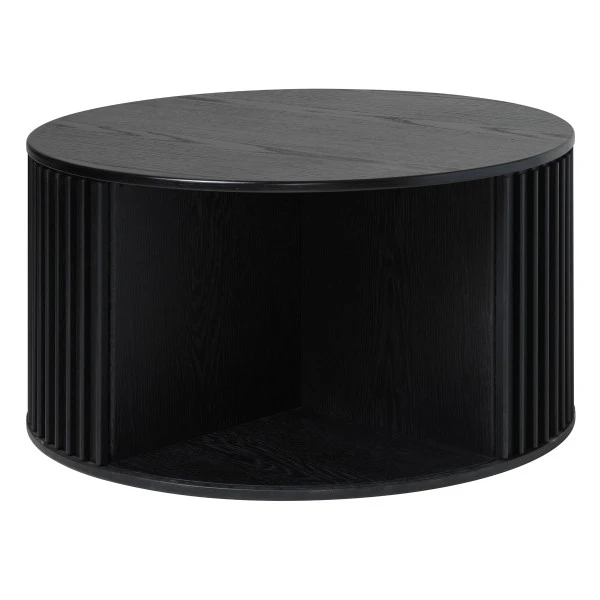 Deze ronde salontafel is gemaakt van zwart eikenfineer, met speelse stroken in het hout. Die stroken verbergen een schuifdeur met toegang tot handige opbergvakken! Zo kun je in de salontafel mooi een stapel tijdschriften, plaids of onderzetters kwijt. Laat de schuifdeur een stukje openstaan als je er gezellige spulletjes in opbergt. De ronde salontafel heeft een diameter van 85 centimeter.