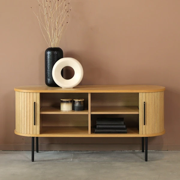 Dit tv-meubel is volledig gemaakt van eiken en heeft zachte, ronde lijnen. Je kunt de deuren een stukje openzetten wanneer je televisie kijkt: zo is de apparatuur handig beschikbaar! Of vul de vakken van het tv-meubel met gezellige decoraties. Het tv-meubel is met 120 centimeter breedte lekker compact: ideaal voor in een krappe zithoek. Dankzij de slanke en hoge poten kun je met de stofzuiger overal bij.