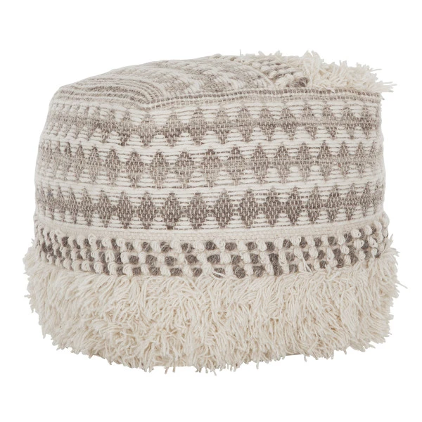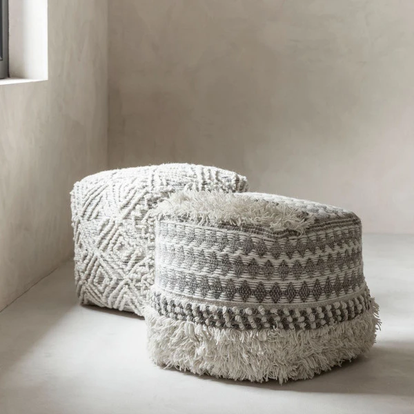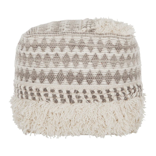 - Zachte, vierkante poef met een mix van kleuren en patronen