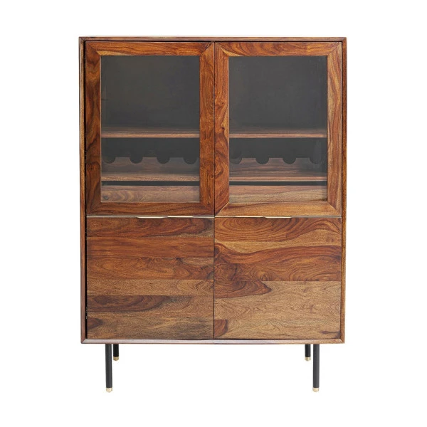De Kare Design Ravello wijnkast van sheesham en glas vormt een gezellig element in je interieur: het hout zit vol prachtige lijnen en kleurvariaties. Tegelijkertijd zorgen het strakke design en de messing details voor een moderne look. De wijnkast is voorzien van een speciaal wijnrek om je beste flessen in te bewaren! Ook voor glazen, onderzetters en een karaf is plaats achter het glas.