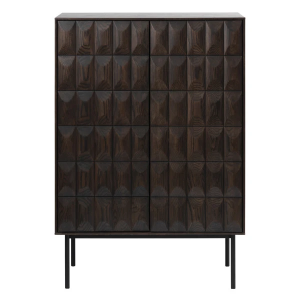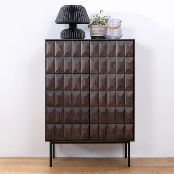 Met deze wijnkast heb je alles bij elkaar wat je nodig hebt voor een lekker drankje. Achter de deuren van donkerbruin eikenfineer met reliëf is plaats voor wijn, sterke drank, wijnglazen, onderzetters, borrelglazen en onderzetters. Alles heeft een eigen plek; je grijpt nooit meer mis! Tenzij je een drankje teveel ophebt, misschien. Met een formaat van 90 bij 129 centimeter heb je altijd wel plaats voor deze wijnkast.