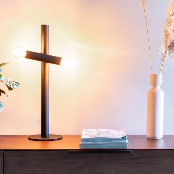 Met deze Zuiver Hawk tafellamp kun je lekker creatief zijn. Het frame van mat zwart metaal is namelijk draaibaar; zet jij de lamp haaks op de poot of maak je er een speels geheel van? Het design van de tafellamp is modern met een vleugje retro. Dat kun je zelf nog versterken met je keuze voor het type lichtbron: een grote bol van rookkleurig glas, bijvoorbeeld. Leuk op het dressoir!