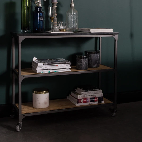 De Dutchbone Consuela trolley komt altijd van pas! Vul de open vakken met serviesgoed en plaats je mooiste theeservies op het zwart marmeren blad. Dankzij de 4 zwenkwielen rol je de trolley zó dichterbij de eettafel, waar je deze met de blokkeerstand stil zet. Of gebruik de trolley in de keuken voor pannen, schalen en mandjes met groente.
