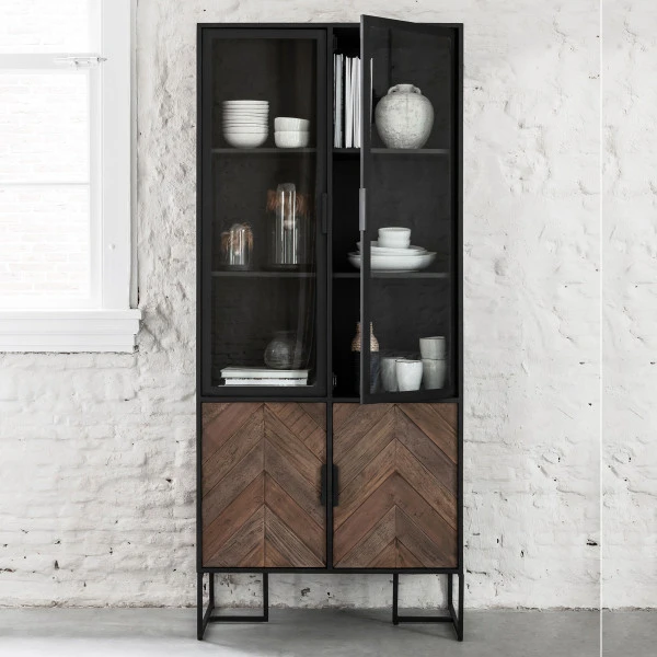 Wat deze DTP Home Criss Cross vitrinekast zo bijzonder maakt is de mix van sfeer en design. De deuren van teak in een jaren ’30 visgraat patroon geven de vitrinekast een gezellige uitstraling. Tegelijkertijd krijgt je serviesgoed de stijlvolle plaats die het verdient in de zwarte kast van teak en metaal. Of gebruik jij de vitrinekast liever voor souvenirs van verre reizen?
